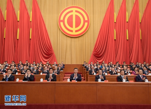 人民大会堂大礼堂气氛庄重热烈。主席台上方悬挂着“中国工会第十七次全国代表大会”的会标,后幕正中象征着中国工会和中国工人阶级团结统一的工会会徽熠熠生辉,10面鲜艳的红旗分列两侧。二楼眺台悬挂着“高举习近平新时代中国特色社会主义思想伟大旗帜,坚持走中国特色社会主义工会发展道路,团结动员亿万职工为决胜全面建成小康社会、实现中华民族伟大复兴的中国梦而奋斗!”的巨型横幅。