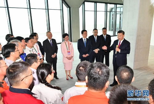 10月23日上午,港珠澳大桥开通仪式在广东省珠海市举行。中共中央总书记、国家主席、中央军委主席习近平出席仪式,宣布大桥正式开通并巡览大桥。这是习近平会见大桥管理和施工等方面的代表,同他们亲切交谈。 新华社记者殷博古摄