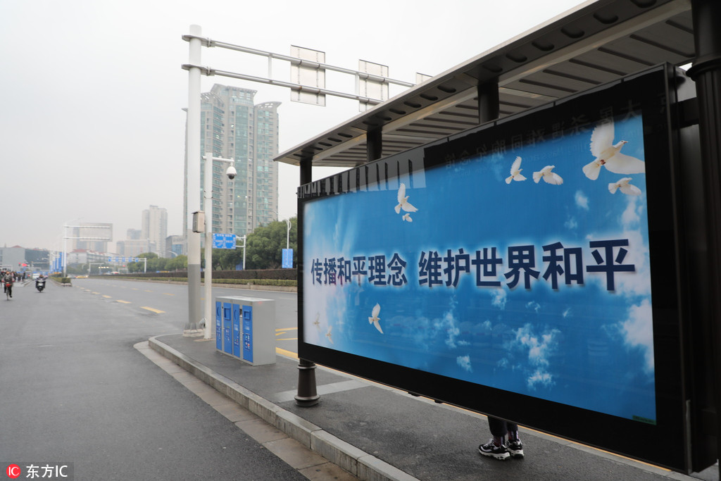 12月11日下午,笔者来到侵华日军南京大屠杀遇难同胞纪念馆,大屠杀遇难同胞纪念馆封头上一块块黑底白字“国家公祭”牌子格外醒目。“传播和平理念,维护世界和平”、“牢记历史,珍爱和平”标语已竖立和张贴在纪念馆周边的道路上路灯杆、公交站台橱窗内,以庄严肃穆的氛围迎接即将到来的南京大屠杀死难者国家公祭日。现场准备就绪,安保、志愿者周围巡查,道路环境整治干净。