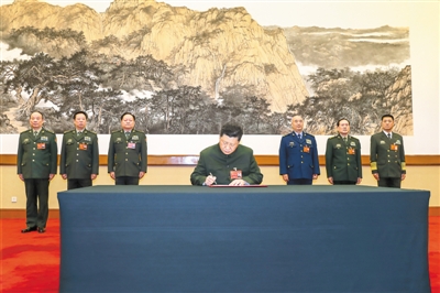中央军委主席习近平出席会议并发表重要讲话。这是习近平签署