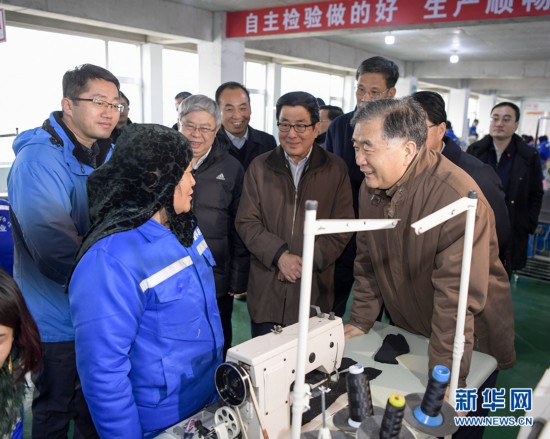 近日,中共中央政治局常委、全国政协主席汪洋在甘肃临夏回族自治州调研脱贫攻坚工作,看望慰问贫困群众和基层扶贫干部。这是1月14日,汪洋在和政县考察扶贫车间,调研东西部扶贫协作情况。 新华社记者 李学仁 摄