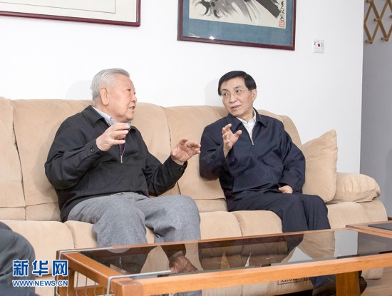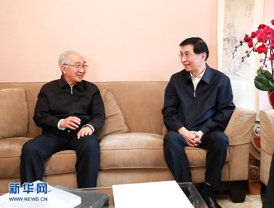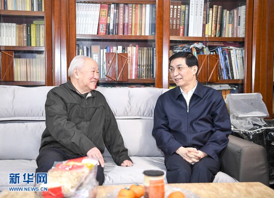 1月31日,中共中央政治局常委、中央书记处书记王沪宁代表习近平总书记和党中央在北京看望文化界知名人士和科技专家,向他们致以诚挚问候,向广大文化工作者和科技工作者致以新春祝福。这是王沪宁看望中国科学院院士、凝聚态物理专家赵忠贤。 新华社记者 王晔 摄