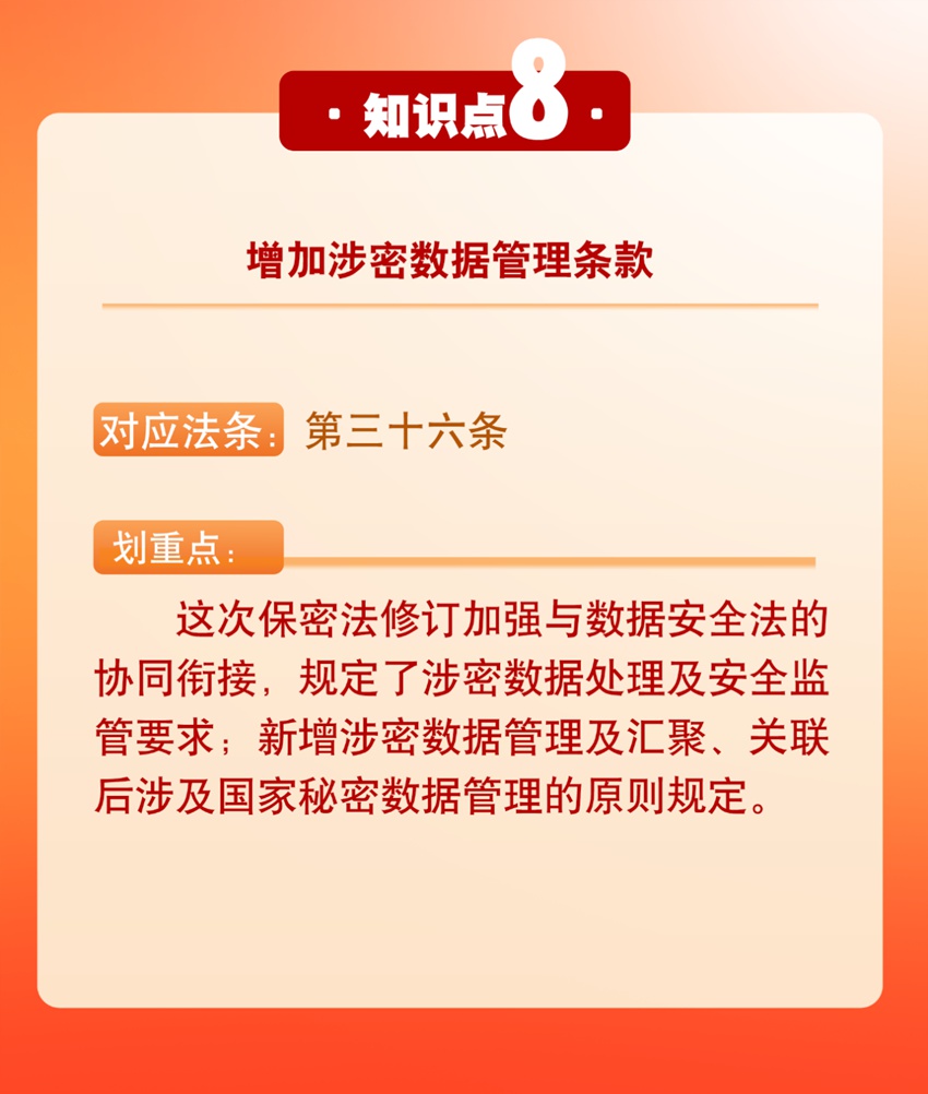 随着保密法的修订颁布,学习贯彻新保密法已成为保密战线当前和今后一个时期的重要任务。今天,让我们一起来学习保密法10个新的知识点,帮助大家进一步学习掌握新法内容,不断提高依法管理国家秘密的能力和水平。